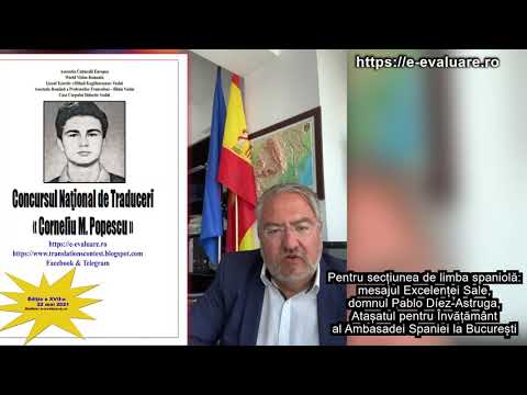 Mesajele susținătorilor Concursului Național de Traduceri „Corneliu M. Popescu”, ediția a XVII-a, 22 mai 2021, pentru elevii participanți. Pentru secțiunea de limba spaniolă: mesajul Excelenței Sale, domnul Pablo Díez-Astruga, Atașatul pentru Învățământ al Ambasadei Spaniei la București